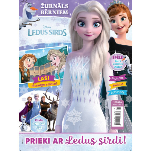 Disneja studijas animācijas filmas “Ledus sirds” varoņi – māsas Elza un Anna, kalnietis Kristofs, ziemeļbriedis Svens un jautrais sniegavīriņš Olafs – stāstos, atjautības uzdevumos, krāsu darbos, spēlēs un plakātos! Kopā ar katru žurnālu – burvīga dāvaniņa! Nedot bērniem, kas jaunāki par 3 gadiem, jo satur sīkas detaļas - aizrīšanās risks!